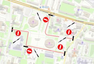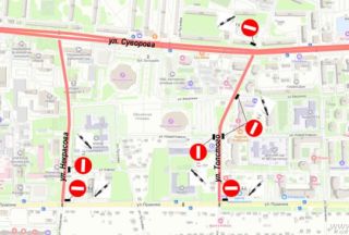 9 мая с 10 до 23 часов аналогичный запрет будет действовать на участке улицы Бакунина от Толстого до Суворова, на участке улицы Новый Кавказ от Толстого до Пугачева и на участке улицы Пугачева от улицы Новый Кавказ до Некрасова.